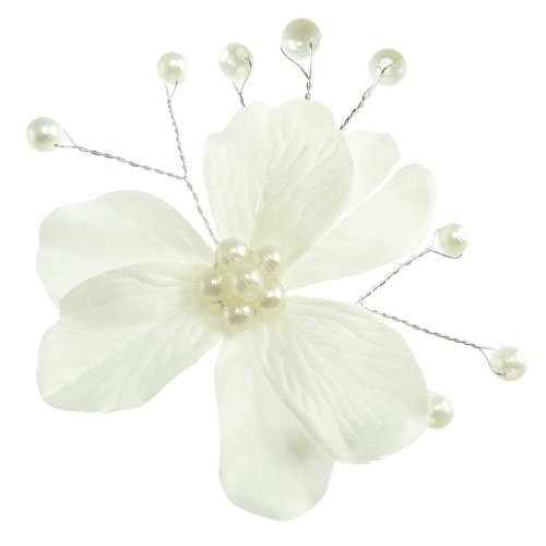 - Une pince à cheveux : Fleur blanche en tissu, avec des perles imitation culture.